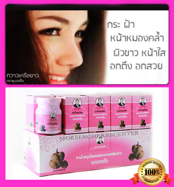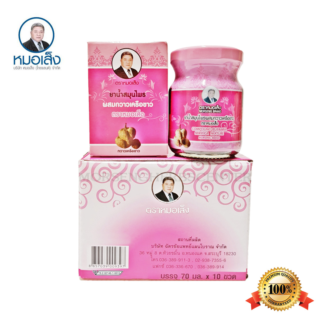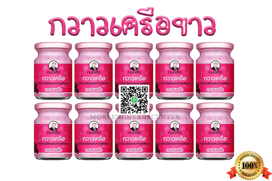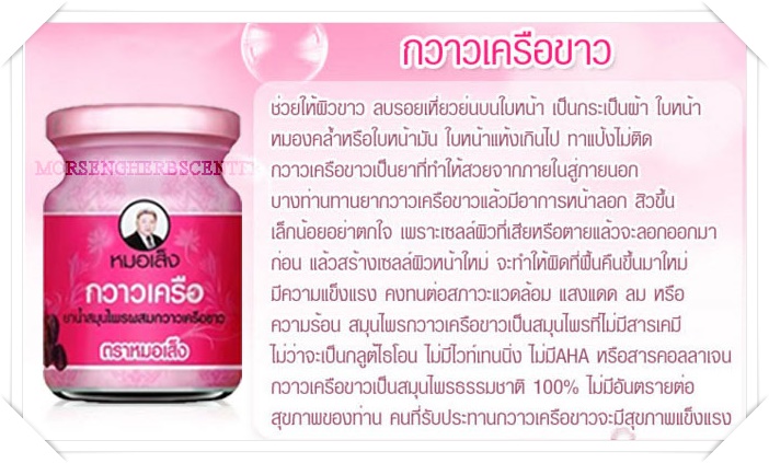 ยาบำรุงกวาวเครือขาวตราหมอเส็ง เป็นยาบำรุงร่างกาย บำรุงผิวพรรณ ช่วยให้หน้าอกใหญ่ เต่งตึง ช่วยให้ผิวขาว ลบรอยเหี่ยวย่นบนใบหน้า เป็นฝ้า กระ หมองคล้ำ หรือใบหน้ามัน ใบหน้าแห้งไป ทาแป้งไม่ติด ให้ดีขึ้น